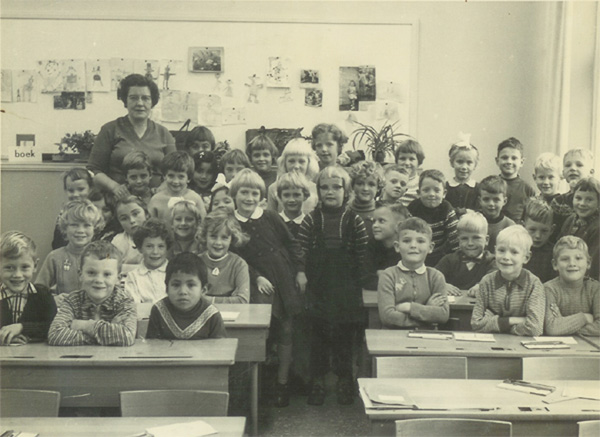 Achterste rij staand vlnr: Mevr. M.A. Pannekoek-van Est*, ???, ???, Wil Olivier*, ???, ??? en ???. 2e rij van achteren staand vlnr: Els Pronk (links van de juf), Simone Dijkgraaf* (Mevr. Pannekoek heeft haar handen op Simones schouders gelegd), Lya Vros*, ??? en Arjo Kiewiet* (meisje met zeer licht blond haar). 3e rij van achteren staand vlnr: ???, ??? (meisje met strik), Marjan Wolsheimer*, Marijke Wolsheimer*, ???, Piettie Brouwer*, ???, ???, ???, ???, ??? en ??? (stapje ervoor). Zittend links achterste rij vlnr: ??? (gezicht niet geheel zichtbaar), Christine Withaar* en Henriëtte Berkel* (blond haar met strik). Zittend links 2e rij van achteren vlnr: Tonny de Bruijn*, Yvonne Riebeek* en ???. Zittend links voorste rij vlnr: ???, ??? en ???. Zittend rechts achterste rij vlnr: ???, ??? en ???. Zittend rechts voorste rij vlnr: ???, André Hollestelle (†) en ???. Niet op de foto, maar zat wel in deze klas: Dolly Vink*. *)adres- of mailgegevens bekend **)staat op www.schoolbank.nl (nog geen e-mail adres bij ons bekend) 31-7-2010.  |