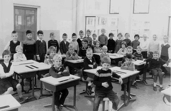 Staand vlnr: ???, Paul Coenraad*, Aarnout Melis*, Henk Berkel*, ???, Paul Teng*, Ruud van Roijen*, ???, ???, Bert de Bruin, ???, ???, Marion Bruggeling*, ???, Anke Scheepbouwer, Cock van Dorssen en Henk Jochems*. Groepje meisjes links in beeld vlnr: Joke Schilperoort*, ??? en ???. Daarachter in het midden: Willem Spaans* en Mevr. T.C. de Vries*. Groepje meisje links achterin de klas vlnr: ???, ??? (meisje met bril) en ???. Groepje jongens rechts in de klas bij het raam vlnr: ???, ??? en ???. Twee jongens rechts vooraan in de klas vlnr: Sjaak van Unnik* en ???. Jongen (tafel links vooraan in de klas) Harry Broekhuizen en geheel vooraan: Wim Elenbaas*. *)adres- of mailgegevens bekend **)staat op www.schoolbank.nl (nog geen e-mail adres bij ons bekend) 19-03-2008.  |