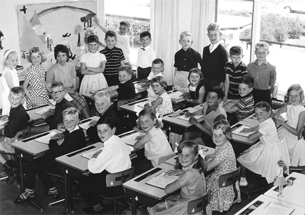 Voorste rij zittend bij de juf vlnr: Eric Voortman*, Johan Vuijk*, Paul Keus* en Peter van Selm*.