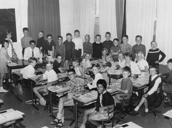 Staand vlnr: Lia Smit, Elly Bakker*, Dhr. B.T.J. Dubbeld*, pal achter de meester staat Peter de Rooij*, Cees Molsbergen*, Willem (Bill) Maalsen*, Fred Sieval*, Arjan van Oostveen, Dick van der Harst (†1994), Jaap Westerhof*, Ronald Haze*, Hans Martin Neven*, Frits Pot*, Peter Vink*, Hans van de Valk en Wim Eshuis. Voorste rij zittend bij de meester: René Bijkerk , Josje Wessels, Cella Sampiemon* en Marie-Anne Elenbaas*. 2e rij zittend vlnr: Philip Kouwen*, Tiny Lelijveld*, Elly Buurmans* en Hannie Groen*. 3e rij zittend vlnr: Evert Moens*, Bert Jacobs*, Rita Mulders* en Martie Verstrate*. Achterste rij zittend vlnr: Thelma Bachet*, Johan van Houten*, Marianne Knotter* en Johan (nu Hans) Kardol*. *)adres- of mailgegevens bekend **)staat op www.schoolbank.nl (nog geen e-mail adres bij ons bekend) 15-5-2008.  |