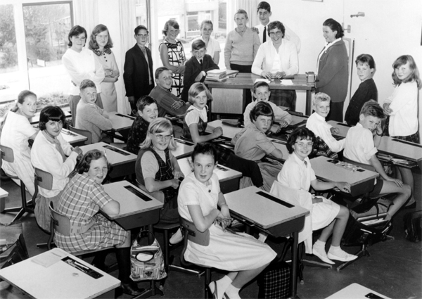 Voorste rij zittend bij de juf vlnr: Rob Hederik*, Dick van den Bosch* en Cees Pisuisse*.