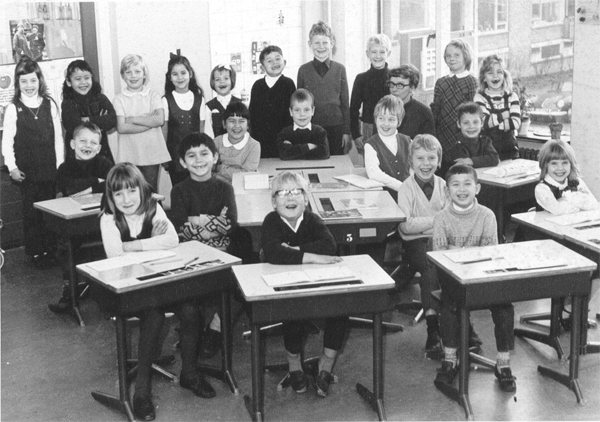 Achterste rij zittend vlnr: Wim Roest*, Joyce Smulders? of Maureen .....?, Hans (nu Hans-Peter) de Kloe*, Yvonne Buijs*, Mevr. T.C. de Vries* en Hans Schermer*.
