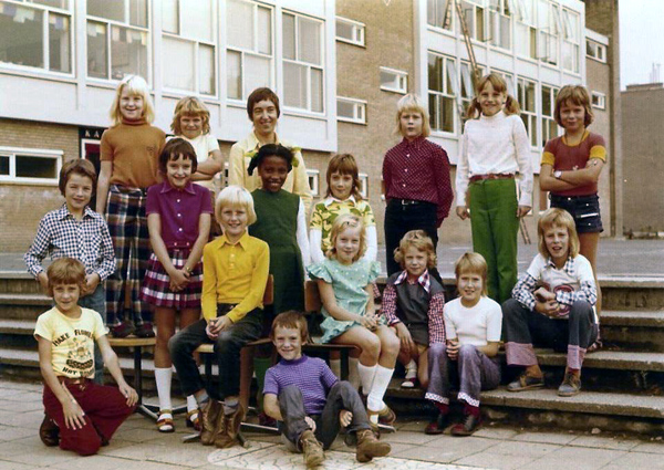 Achterste rij staand vlnr: Anja Keus*, Brenda Lubout († 1980), Mevr. A.H. Kruikemeyer († 9-11-2008), Arjan Dauphin*, Josina Nieuwdorp* en John Haffert*.