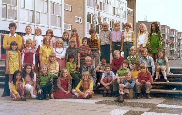Achterste rij staand vlnr: Dhr. A. Nieuwenhuyzen*, ???, ???, Willeke Luf, ???, Elly .....?, Fred Nitzschke*, Kees .....?, Elvira van Rijn, Chris Zaal*, Jacqueline Baak* en Jolanda Huizinga. Treetje lager staand vlnr: Heleen .....?, Esther de Kloe*, Ellen van Geest*, Kitty Maas*, Hetty Greeven* en Fred van Zanten*. Zittend vlnr: ??? (stoel), Gaby Oberweis* (stoel), Frank van Veen*, Hans van Hek*, Nick Bos*, Edwin Harteveld**, ??? en ???. Links zittend op het schoolplein vlnr: Leonie van Hek*, Jacqueline Merkus*, Karin de Rijke*, Jolanda Braun* en Sandra van Rijn*. Rechts groepje van 5 jongens zigzaggend vlnr: Paul Tilleman/Tieleman, Jeroen Slootweg* (groen shirt), André de Bruin* (mond open), Japie .....? (gele trui) (woonde bij Nick Bos boven) en Ruud Hoog. *)adres- of mailgegevens bekend **)staat op www.schoolbank.nl (nog geen e-mail adres bij ons bekend) 31-7-2010.  |
