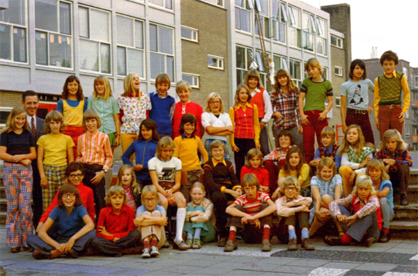 Achterste rij staand vlnr: Annelies Coenraad*, Sandra van Hek*, Marie Louise Zieren*, Erik Smit*, Hauke Jansen**, Inge Wolsheimer, Sonja Stienstra*, Ellie Heemskerk*, Karin Fransen*, Laura van Geest*, Bernard van der Lee* en Victor Nitzschke*. 3e rij van achteren staand: Hetty ter Meulen († 8-1-2006), Dhr. F.J. Besselaar*, Wilma Schipper*, Fred de Wit*, Sandra Oberweis* en Robbie Spaans* (gele trui). 3e rij van achteren zittend vlnr: Paul Hederik*, Richard de Bruin, Laura Braun* en Rolf Sips*. 2e rij van achteren zittend (8 personen op grond, 2x op stoel en trede) vlnr: Ronald Huizinga, Sonja Schüller, Yolanda Lubout*, Anton van Delden*, Anita Luf, Yvonne van de Hoeven, Jolanda Schermer* en Rob Hols*. Voorste rij zittend op de grond vlnr: Erik Roet*, Maarten Groen, Robert Mallee, Marie Louise van der Zwan*, Arjen Muurling*, Hans Zaal* en Fred Harteveld*. Niet op de foto, maar zat wel in deze klas: Marja Vogelaar. *)adres- of mailgegevens bekend **)staat op www.schoolbank.nl (nog geen e-mail adres bij ons bekend) 23-5-2008.  |