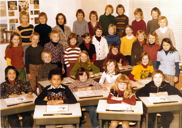 Achterste rij staand vlnr: Paul den Dulk*, Ed van Zanten*, Mevr. A.H. Kruikemeyer († 9-11-2008), Arthur Egges*, Bennie van der Vlist, Johan Lijklema*, Marco Valkenburg, Wendy Duran**, ??? en Rob van Vleuten (†). 4e rij staand vlnr: Jolanda van Leeuwen*, René van Hattem, Rob Smit*, Monique Spaans, ???, Rob Verhoeven*, Eric Korfmaker*, ???, Brenda Lubout († 1980), Renate van Maanen* en Ingrid Wouters. 3e rij zittend vlnr: Ruud Bosch*, ??? en Marco Bak*. 2e rij zittend vlnr: Mitchell Oberweis*, Carla Koppes, José van Doezum en Pauline de Bruin*. Voorste 3 kinderen vlnr: Odylio Macnack*, Nancy Krijgsman en John Vos*. *)adres- of mailgegevens bekend **)staat op www.schoolbank.nl (nog geen e-mail adres bij ons bekend) 30-8-2010.  |