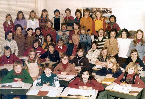 Achterste rij staand vlnr: Sandra Bon, Helen .....?, Karin de Rijke*, Elvira van Rijn, Hans van Hek*, Johan Plugge*, Fred Nitzschke*, Jeroen Slootweg*, Nicole .....? en Gaby Oberweis*. 5e rij van boven vlnr: Fred .....?, Mevr. M.A. Pannekoek-van Est*, Joliene Vogelaar*, Willeke Luf, Kitty Maas*, Hans van der Zwan, ???, Ellen van Geest*, Edwin Harteveld**, Mevr. M.J. van Binsbergen*, Martin van Brakel en Jolanda Braun*. 4e rij zittend (4 personen) vlnr: Francina Leentjes, Hetty Greeven*, Dhr. P. Busink († 2001) en Harry .....? 3e rij zittend (5 personen) vlnr: Elly de Bruijn**, Jacqueline Merkus*, (iets naar voren met tafel=) Ruud Hoog, Tineke Jongejans en Rob van Huifte. 2e rij zittend (5 personen) vlnr: Frank van Veen*, Esther de Kloe*, Evert Wagter*, ??? en Jacqueline Baak*. Voorste rij (3 personen) vlnr: Nick Bos*, Chris Zaal* en Leonie van Hek*. *)adres- of mailgegevens bekend **)staat op www.schoolbank.nl (nog geen e-mail adres bij ons bekend) 31-7-2010.  |