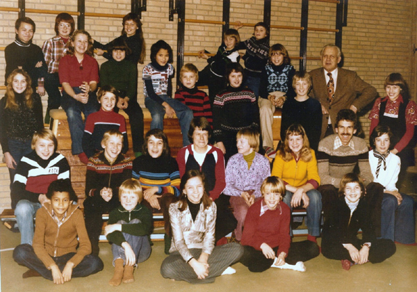 Achterste rij 5 kinderen tegen het wandrek aan vlnr: ???, Bennie van de Vlist, Jolanda van Leeuwen*, Johan Lijklema* en Marco Valkenburg. 4e rij vlnr: ??? (links naast de kast), ???, Carla Koppes en Mitchell Oberweis* (op de kast) Ruud Bosch* en Rob Verhoeven* (tussen kast en bok in) en ??? (op de bok), Dhr. P. Busink († 2001) en Renate van Maanen*. 3e rij staand voor de kast: Arthur Egges* en staand voor de bok: Paul den Dulk*. 2e rij zittend vlnr: Rob Smit*, René van Hattem, ???, Marco Bak*, Eric Korfmaker*, Pauline de Bruin*, Dhr. A. Nieuwenhuyzen* en José van Doezum. Voorste rij zittend op de grond vlnr: Odylio Macnack*, Rob van Vleuten (†), ???, Wendy Duran** en Monique Spaans. *)adres- of mailgegevens bekend **)staat op www.schoolbank.nl (nog geen e-mail adres bij ons bekend) 30-8-2010.  |